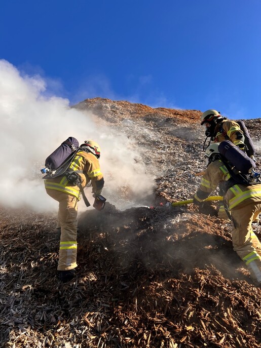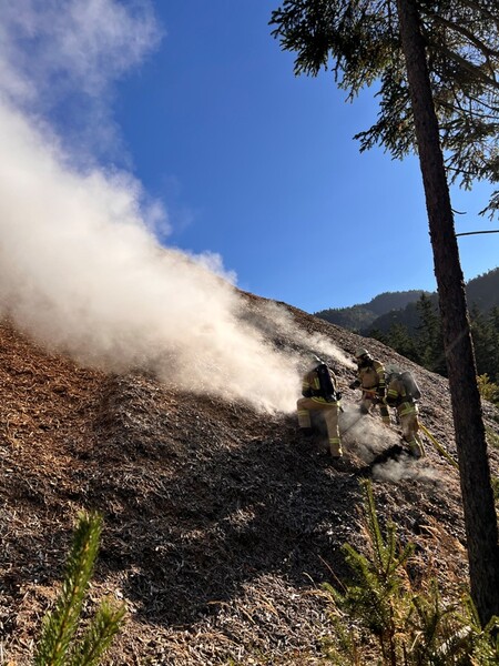 Die Meldung über den Brand bestätigt sich vor Ort und erste Löschmaßnahmen werden mit einer handgeführten Löschleitung unter Atemschutz eingeleitet. Die vermutete Ausbruchsstelle befindet sich dabei an der Hinterseite des Haufens und ist nur über das angrenzende Waldstück erreichbar. Weil eine Hochleitungsspannung der ÖBB direkt über der Brandstelle verläuft wird umgehend die Abschaltung dieser angeordnet.