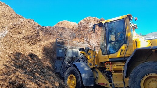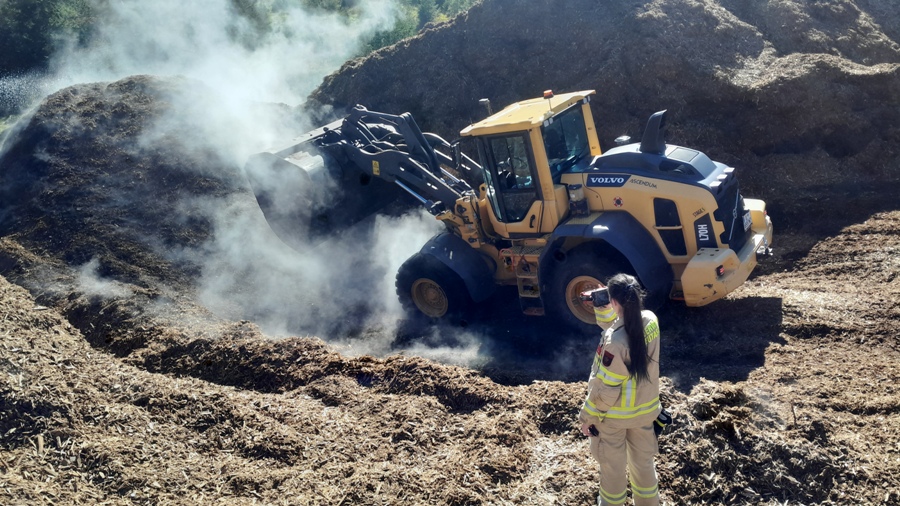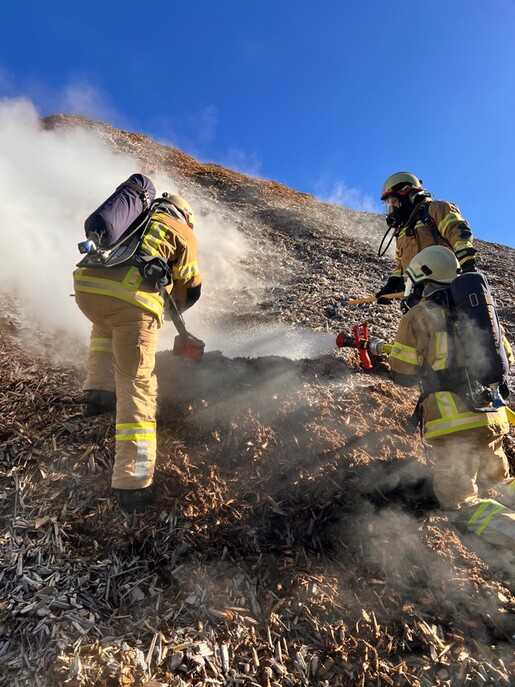 Der Atemschutztrupp kann sodann mehrere Glutnester ausfindig machen und ablöschen. Um den Verdacht auf tiefer sitzende Glutnester nachgehen zu können wird mit einem Radlader begonnen Material zu entfernen.
