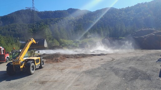 Der Einsatzort befindet sich in unmittelbarer Nähe zum Gewerbegebiet Leutasch in Niederlög. Auf einem dort befindlichen Schotterplatz lagert auf einer Grundfläche von aktuell ca. 2.600 m² das Hackgut zu Zwischenlagerzwecken.