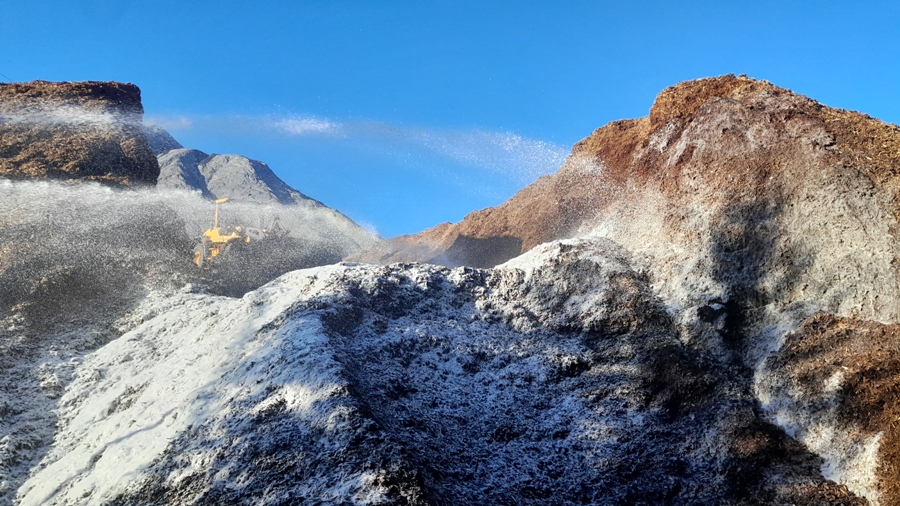 Umgehend werden die Löscharbeiten – stets durch Beimengung von Netzmittel optimiert – wieder fortgeführt. Drei Radlader entfernen Schicht für Schicht das Material. Je weiter diese in Richtung Mitte der Haufenhöhe gelangen, desto intensiver wird der Brand. Tausende Liter Wasser sind dann in den folgenden Stunden von Nöten, um den Brand löschen zu können. Für die Wasserversorgung bedient man sich seit Anbeginn an einem leistungsstarken Hydranten im nahen Gewerbegebiet.