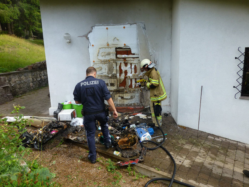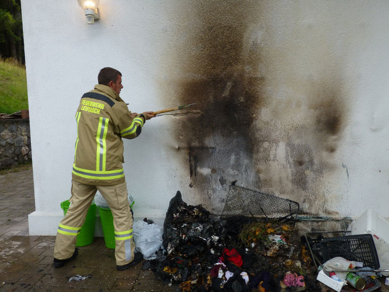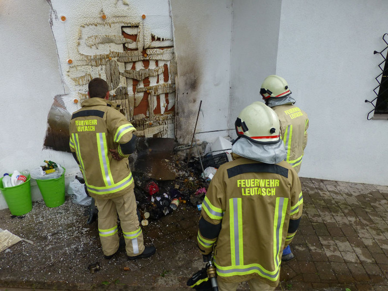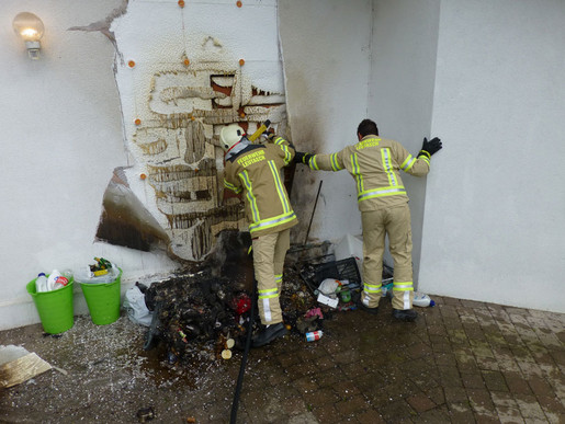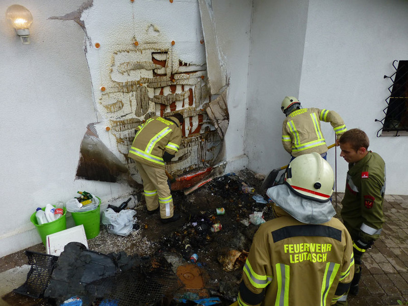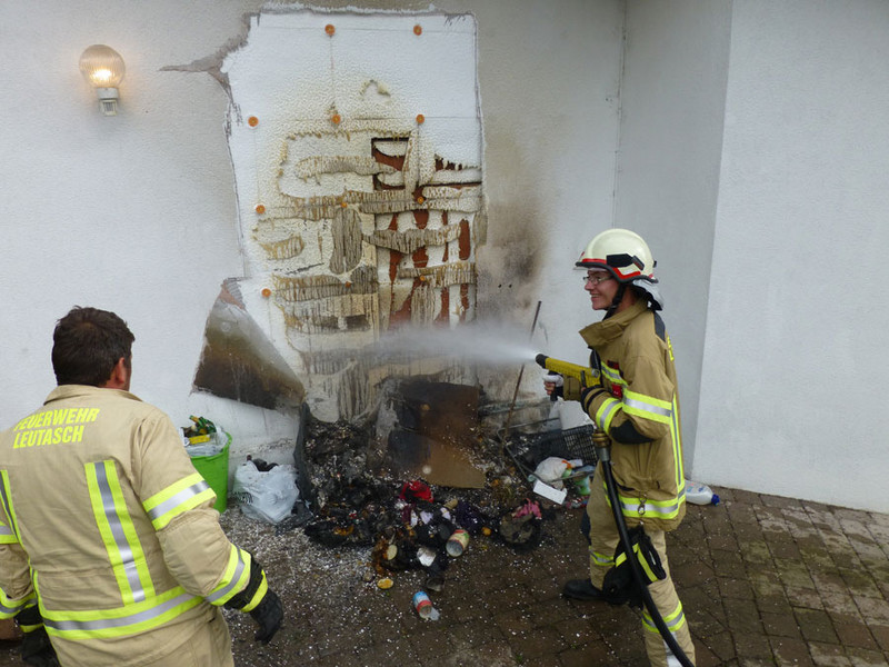 Ein Müllkübel an der Außenseite eines Wohngebäudes hatte Feuer gefangen und drohte auf das Gebäude überzugreifen. Unter Vornahme einer Löschleitung konnte der Brand in der Entstehungsphase eingedämmt und ein Übergreifen auf den Dachstuhl verhindert werden. Durch teilweises entfernen der Wärmedämmung schloss man aus, dass sich weitere Glutnester unter dieser befinden. Nach den notwendigen Nachlöscharbeiten konnte der Einsatz beendet und in das Gerätehaus eingerückt werden.