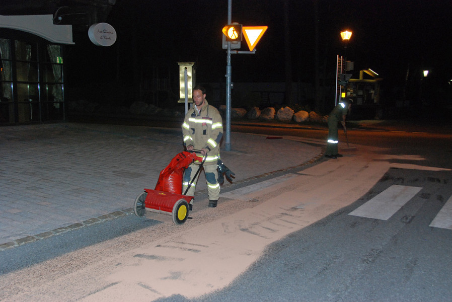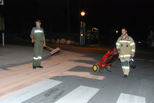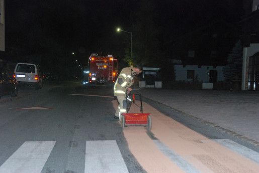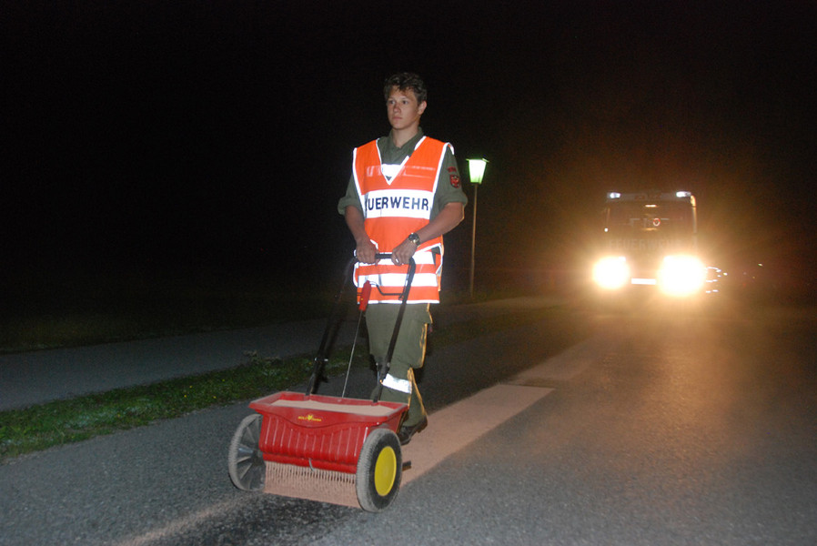 An Ort und Stelle wurde dann auch ein Betriebsmittelaustritt mäßigen Ausmaßes vorgefunden. Nach Absicherung der Einsatzstelle galt es, Bindemittel aufzutragen um die Flüssigkeiten binden zu können. Ordnungsgemäß erfolgte dann die Kontrolle des weiteren Straßenverlaufes, der ebenfalls mit einer geringen Ölspur bedeckt war. Auch diese wurde auf einer Länge von rund 700 m gebunden, ehe der Einsatz nach einer Stunde beendet werden konnte.