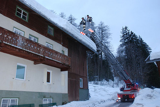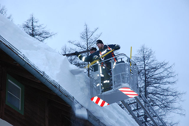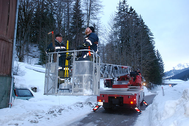 Das betroffene Gebäude befindet sich knapp neben einer Gemeindestraße - eine Dachlawine würde somit eine Gefahr für den vorbeiführenden Verkehr sowie für Fußgänger darstellen. Aus dem Korb der Drehleiter erfolgte die Entfernung der Schneemengen am Vordach des Wohnhauses um ein Abrutschen ausschließen zu können.