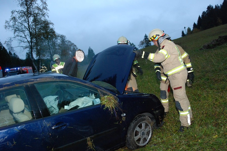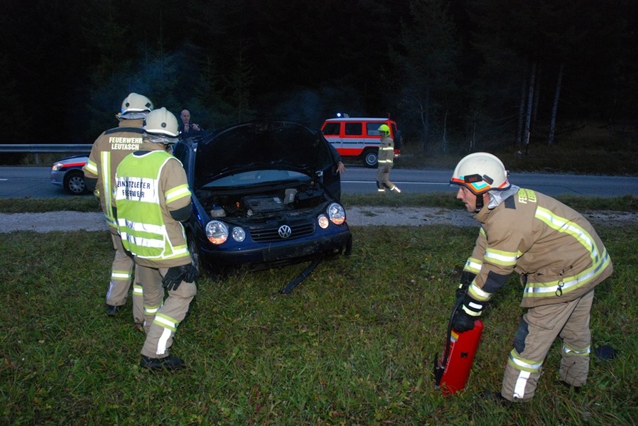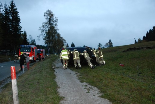 Parallel dazu erging die Alarmierung auch an die Feuerwehren Unterleutasch sowie Seefeld. Beim Eintreffen des Rüstlöschfahrzeuges waren die Kräfte von Rettungsdienst und Exekutive bereits vor Ort und kümmerten sich um die junge Fahrzeuglenkerin. Eine vom Einsatzleiter durchgeführte Lageerkundung ergab einen auf der Seite liegenden PKW, in dem sich keine Personen mehr befanden jedoch Rauch austrat. Umgehend wurde ein Brandschutz errichtet, das Fahrzeug auf die Räder gestellt und die Batterie abgeklemmt.